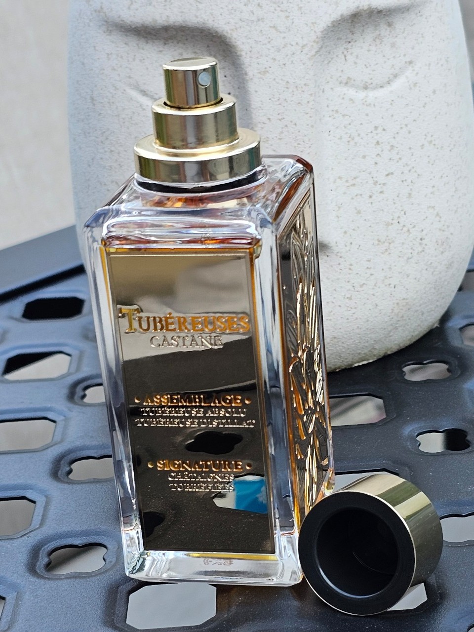 Shyamala Maisondieu brilliantly created a dichotomy of Tuberoses with two complementary extractions. Tuberose Absolute, harvested at nightfall when the scent of the flower is strongest, proves to be rich, smooth and intense, while Tuberose Distillate diffuses the delicate, fresh and evanescent whiff of a bud. The Roasted Chestnut signature, a grilled chestnut accord cozily enwrapped in Venezuelan Tonka Bean, makes this Gourmand White Floral deliciously addictive without being sugary. Almost smoked and then roasted, it is infinitely warming.