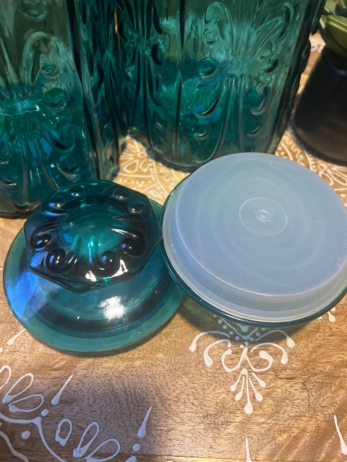 These striking vintage glass canister jars come in a beautiful deep teal/aqua blue color. They feature a decorative embossed scrollwork or fern pattern on the sides and matching patterned lids.